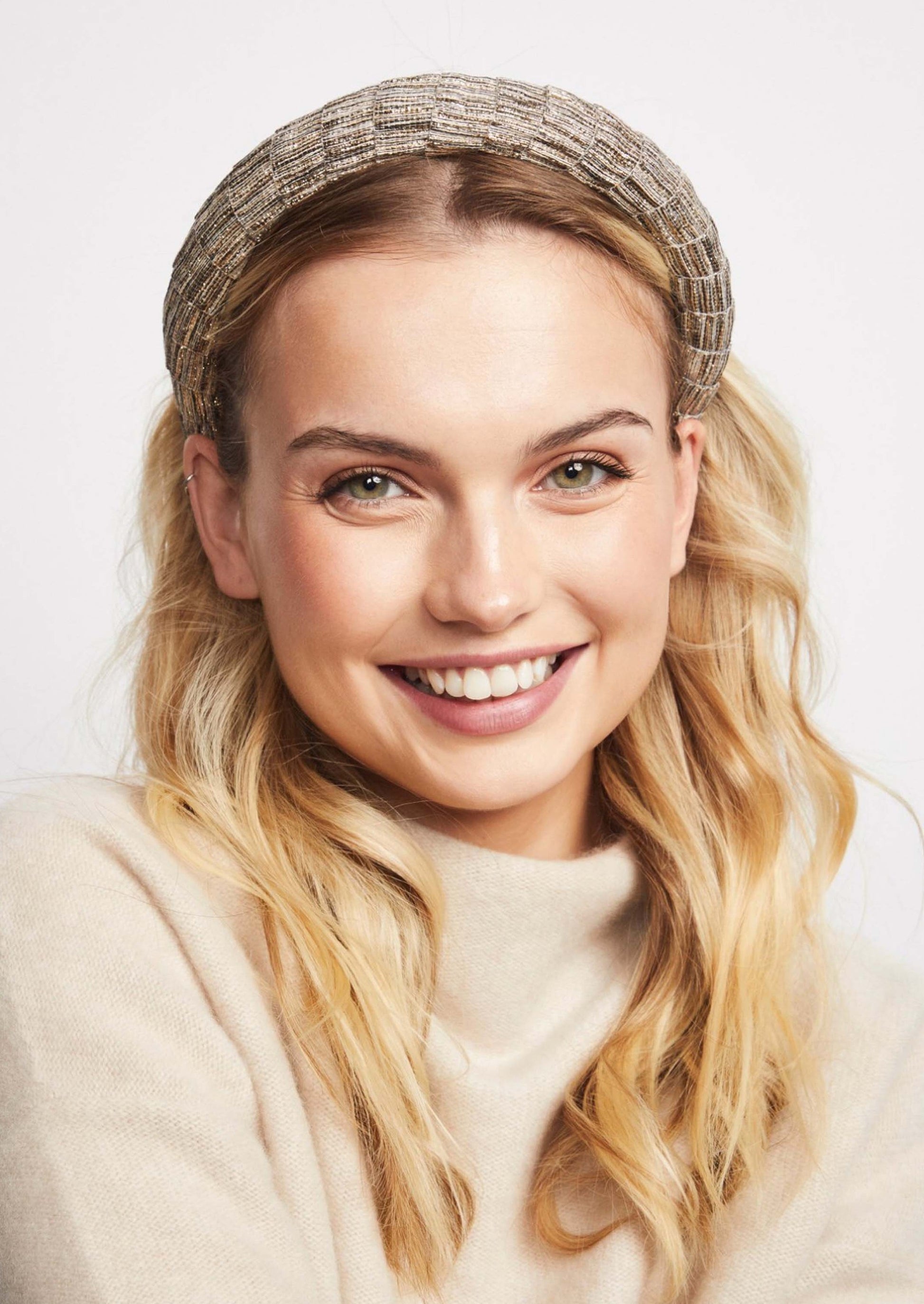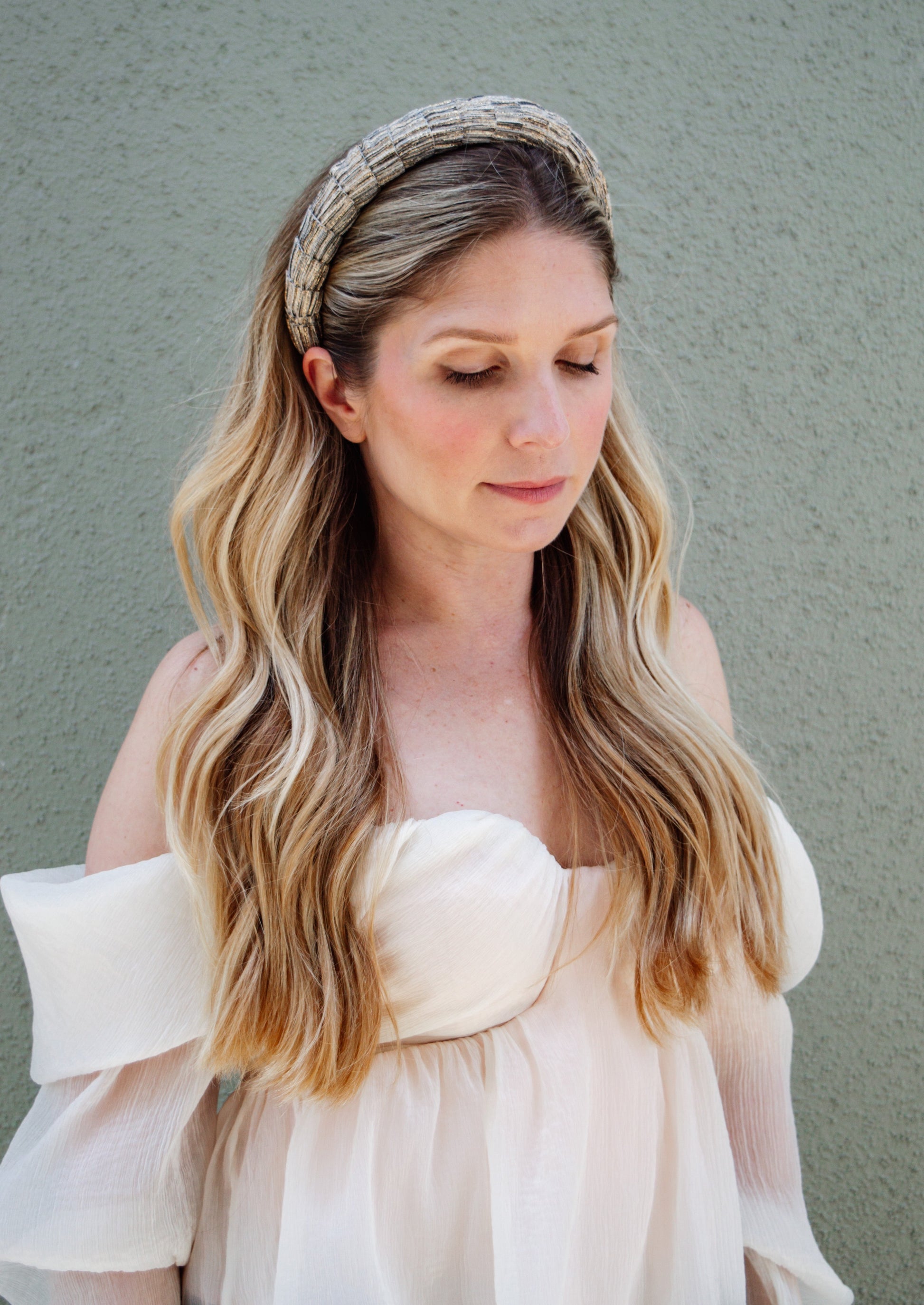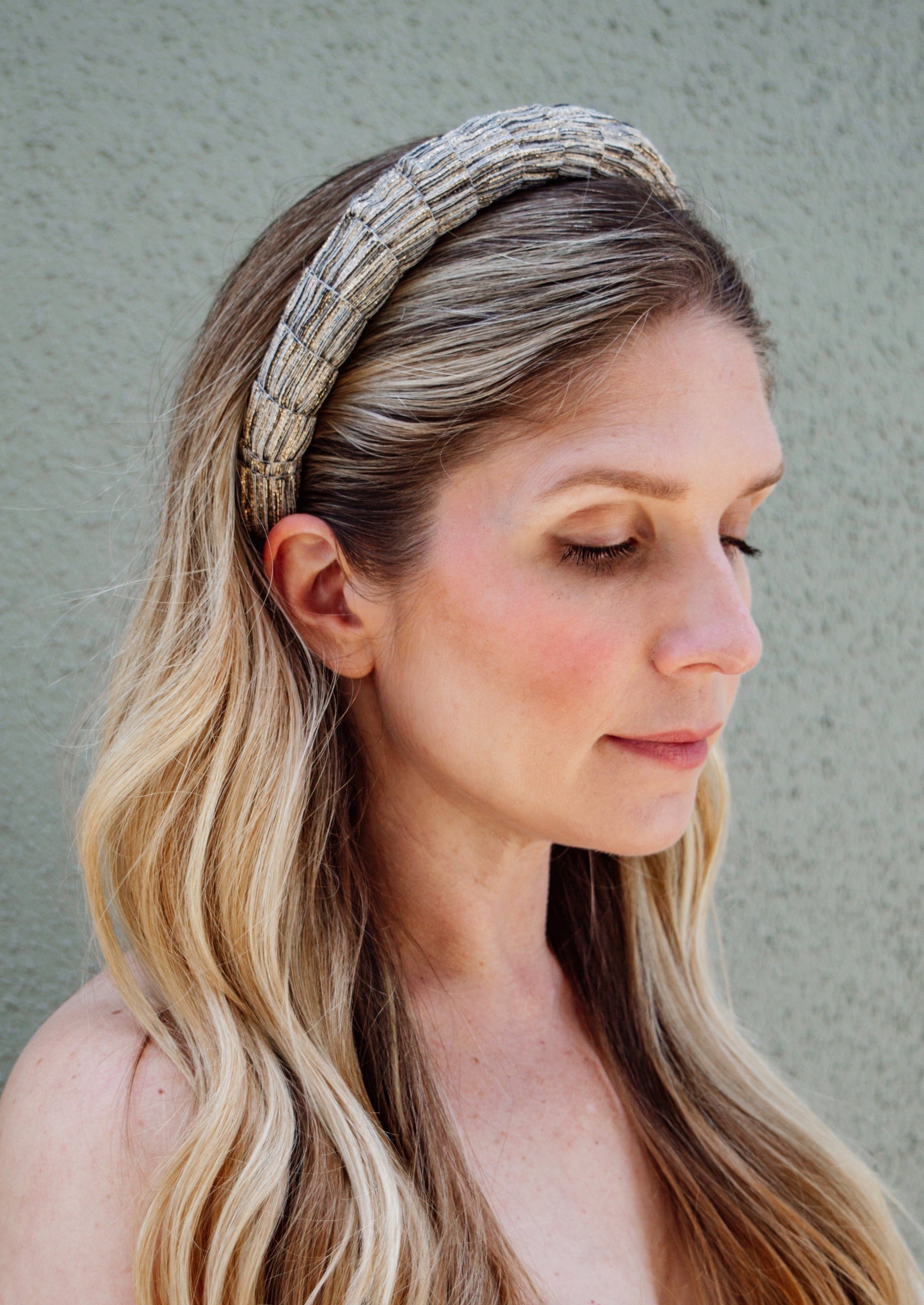 Add a little neutral sparkle with our Bianca headband. Crafted from a gold, black and nude metallic tinsel ribbon, this headband is hand wrapped around a lightly padded base creating a rich and chic luster. Party time!