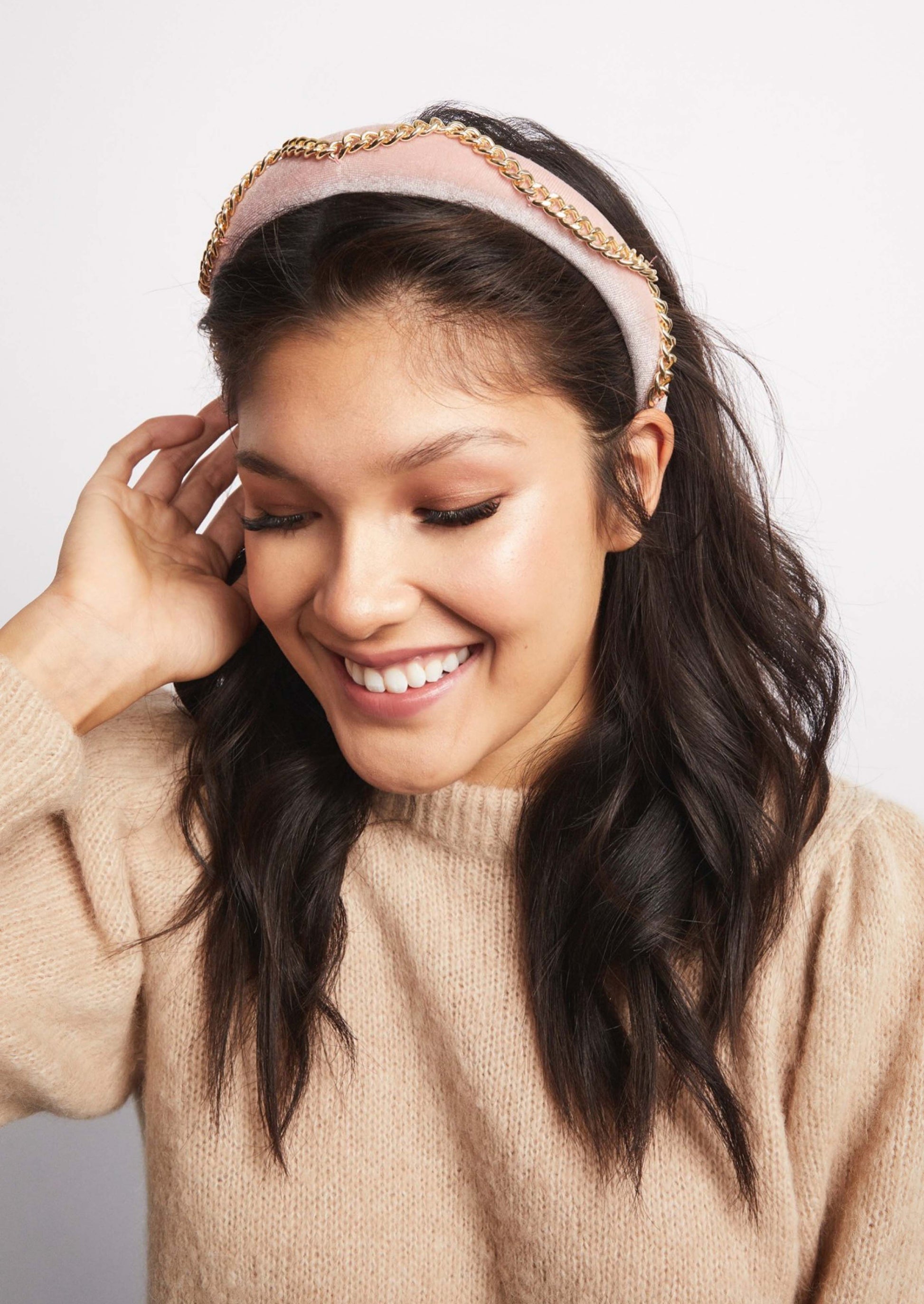 Add a little edge with our Billie headband. Crafted from a rich blush velvet lightly padded base and detailed with a gold chain "wave" pattern, this hair accessory is a little sweet yet sassy.