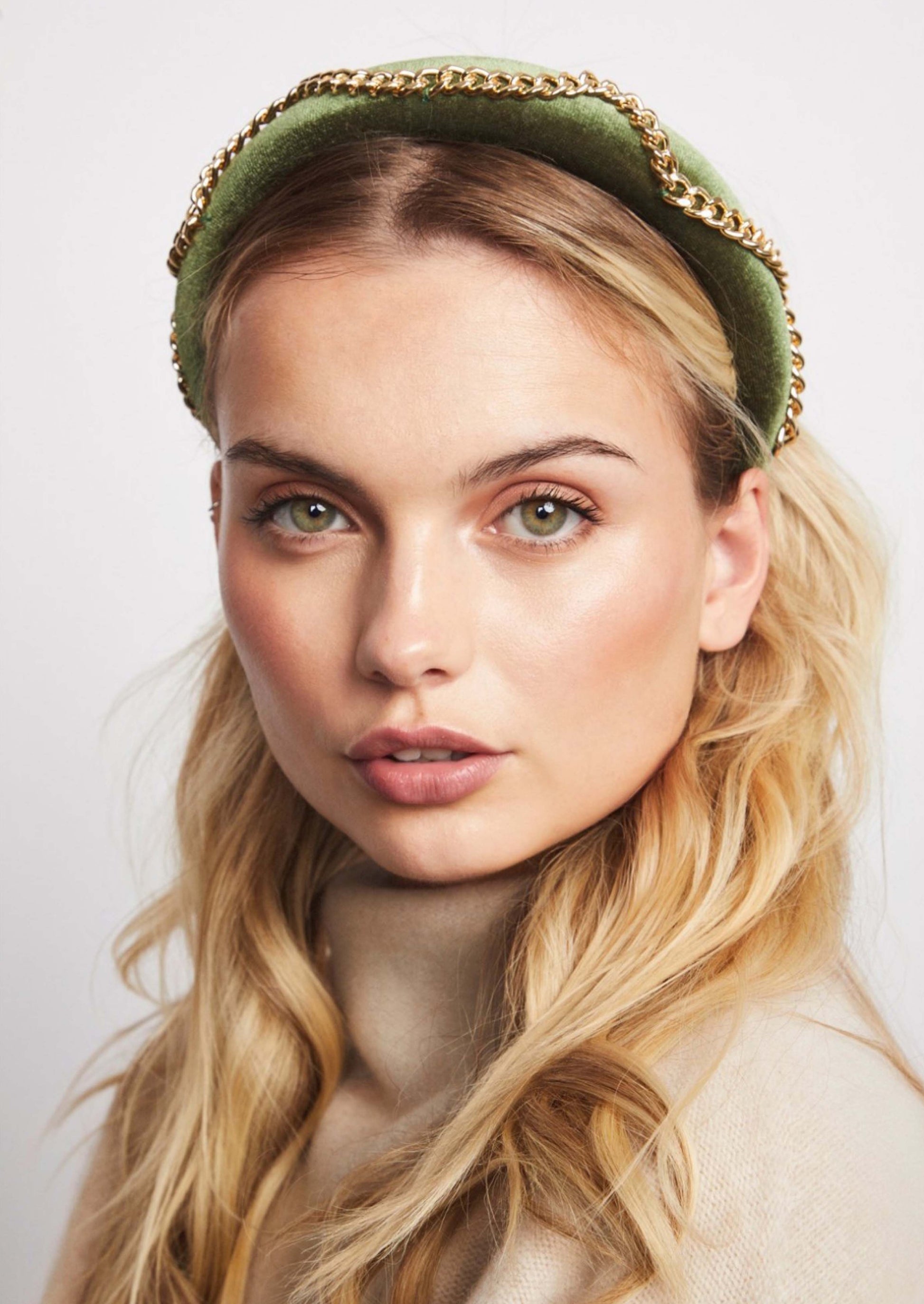 Add a little edge with our Billie headband. Crafted from a rich olive green velvet lightly padded base and detailed with a gold chain "wave" pattern, this hair accessory is a little sweet yet sassy.