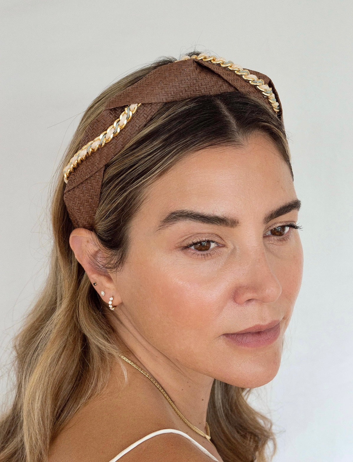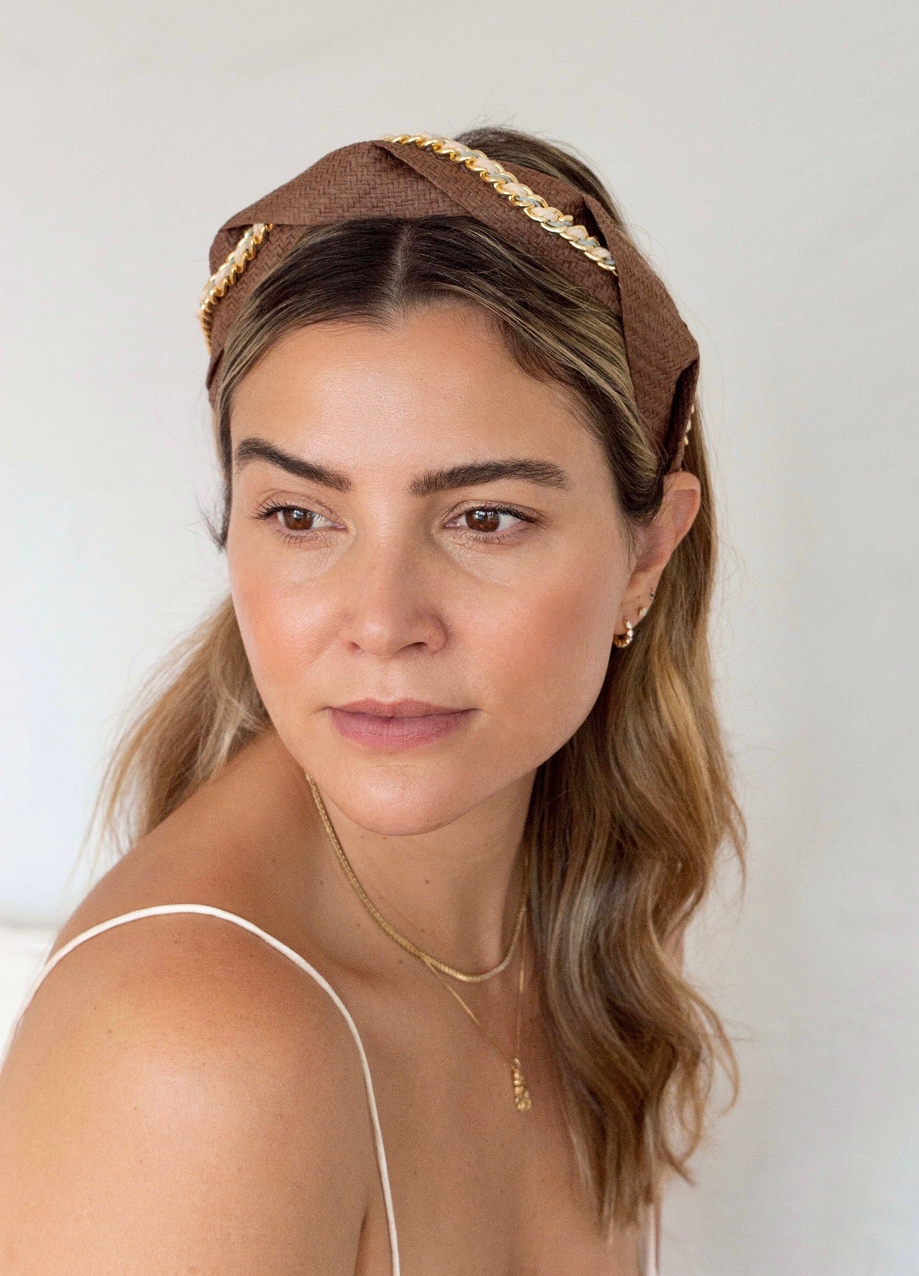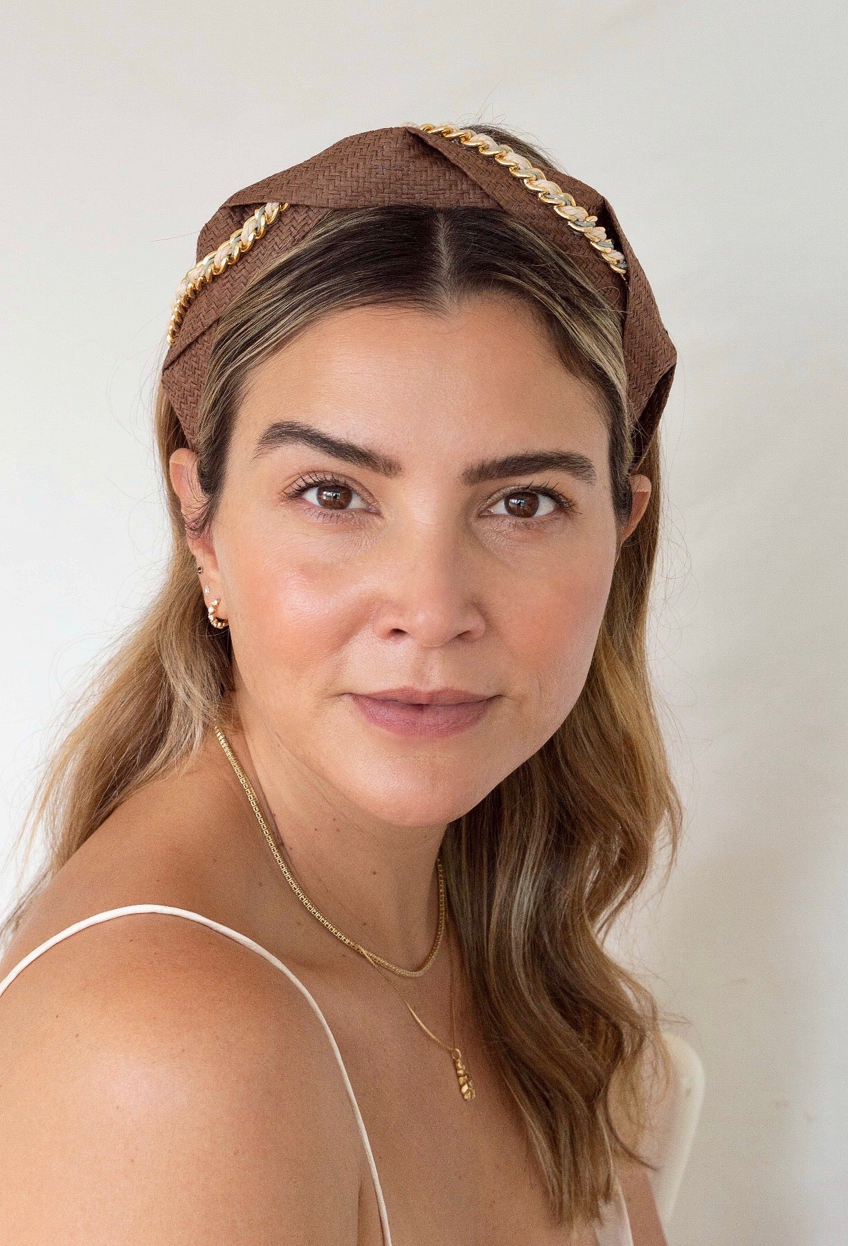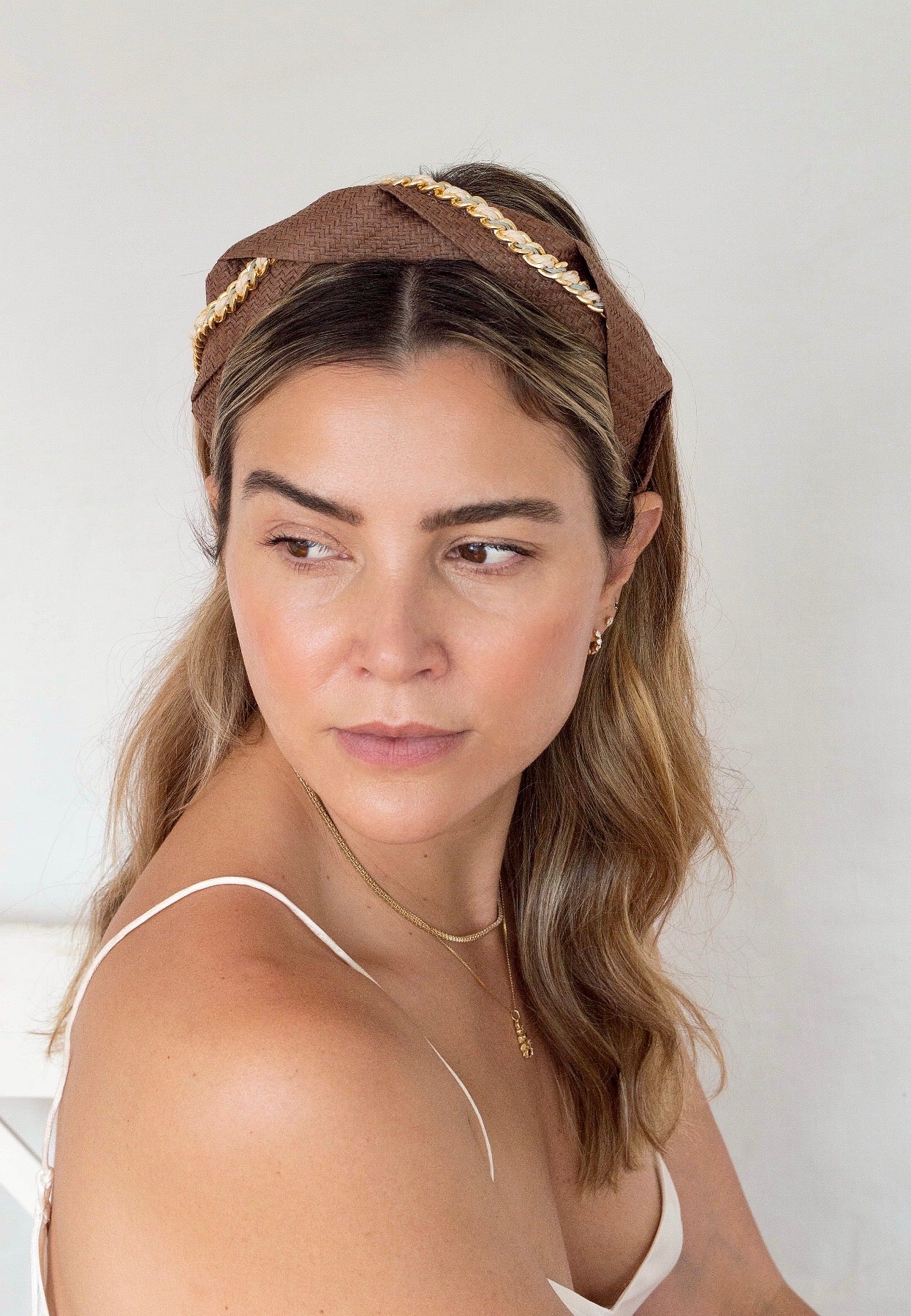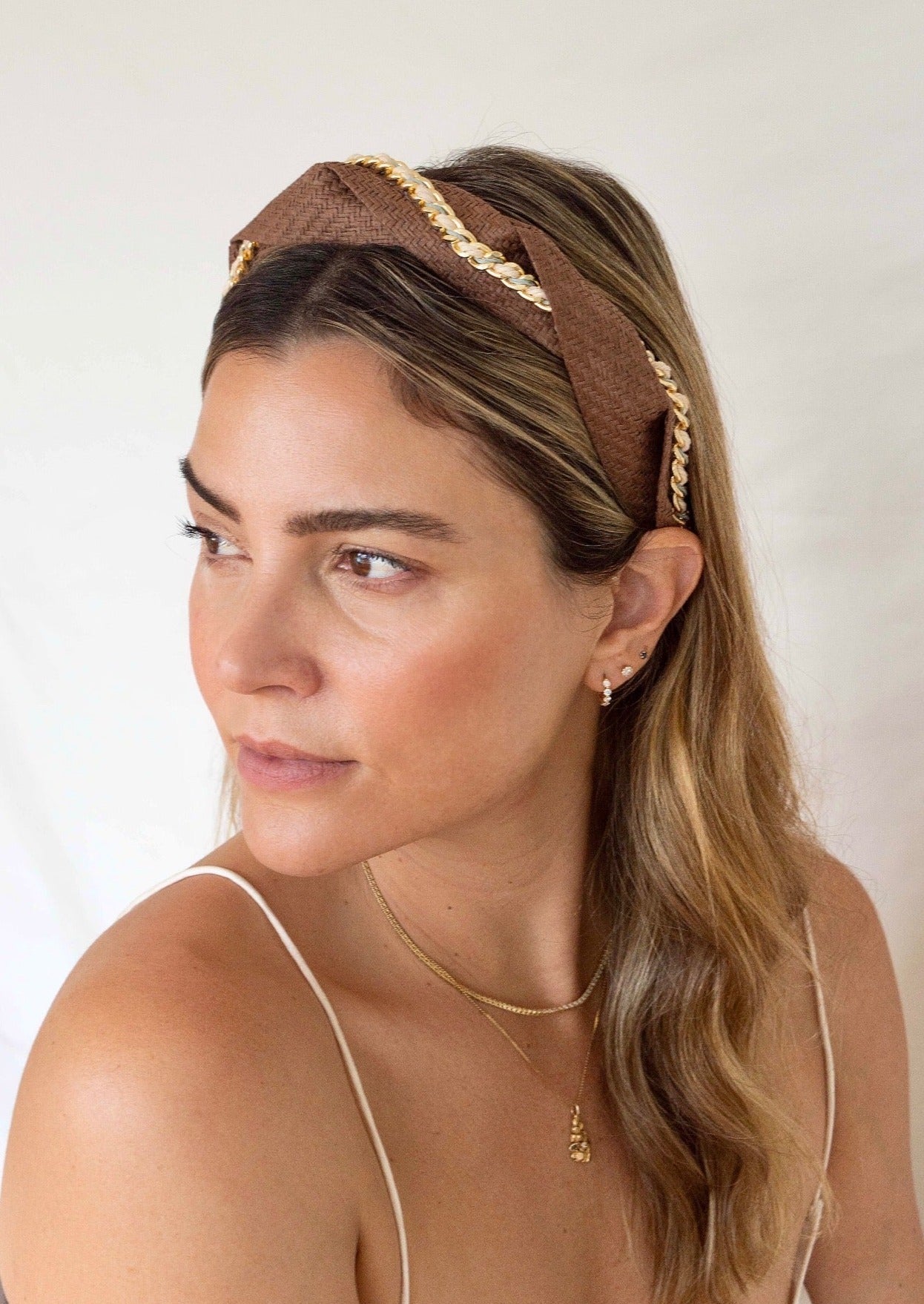 The Carmela headband is a summertime twisted brown raffia straw base embellished with gold chain that is woven with light blue jute and cotton cord. This hair accessory makes a statement with its casual yet sophisticated vibe.