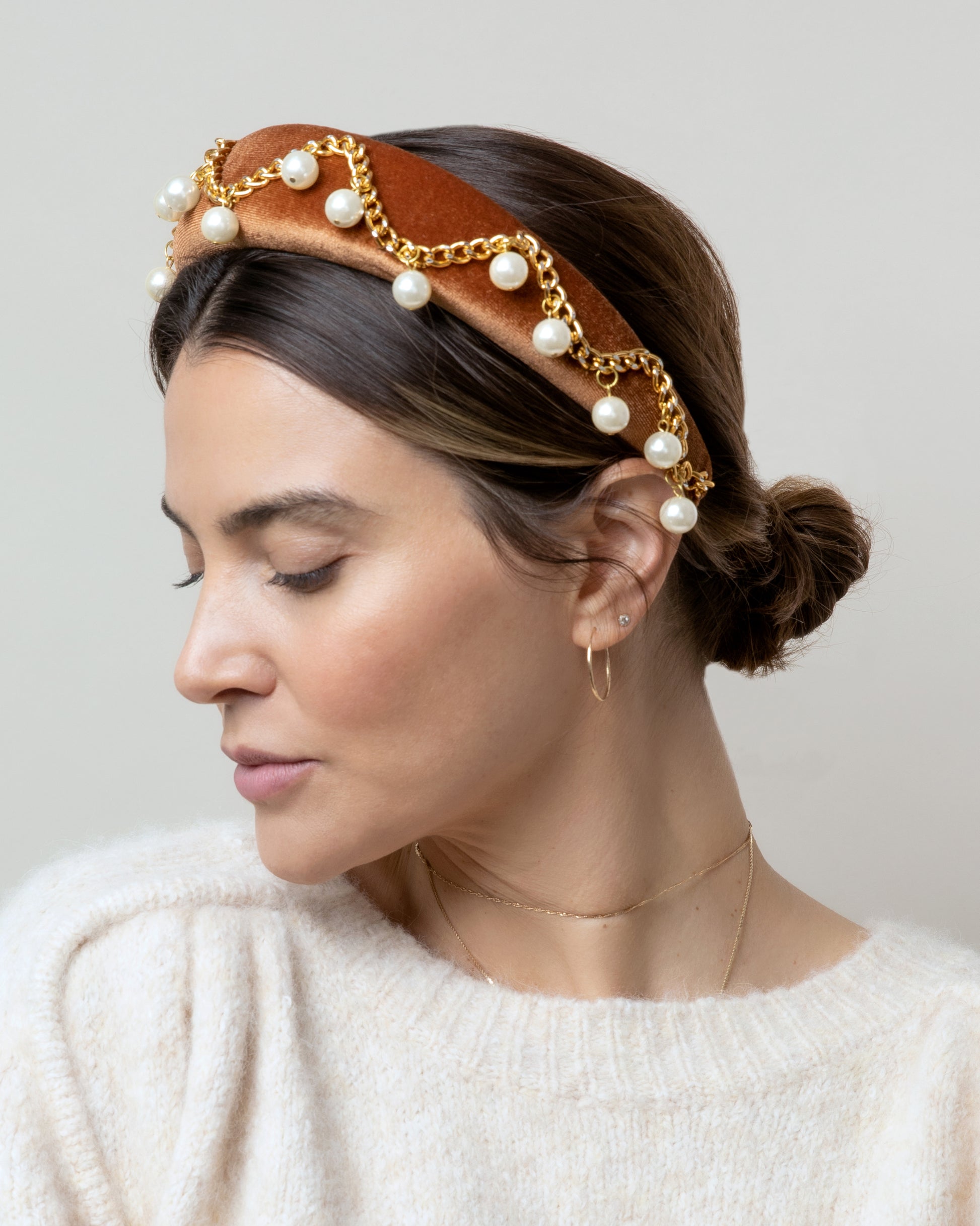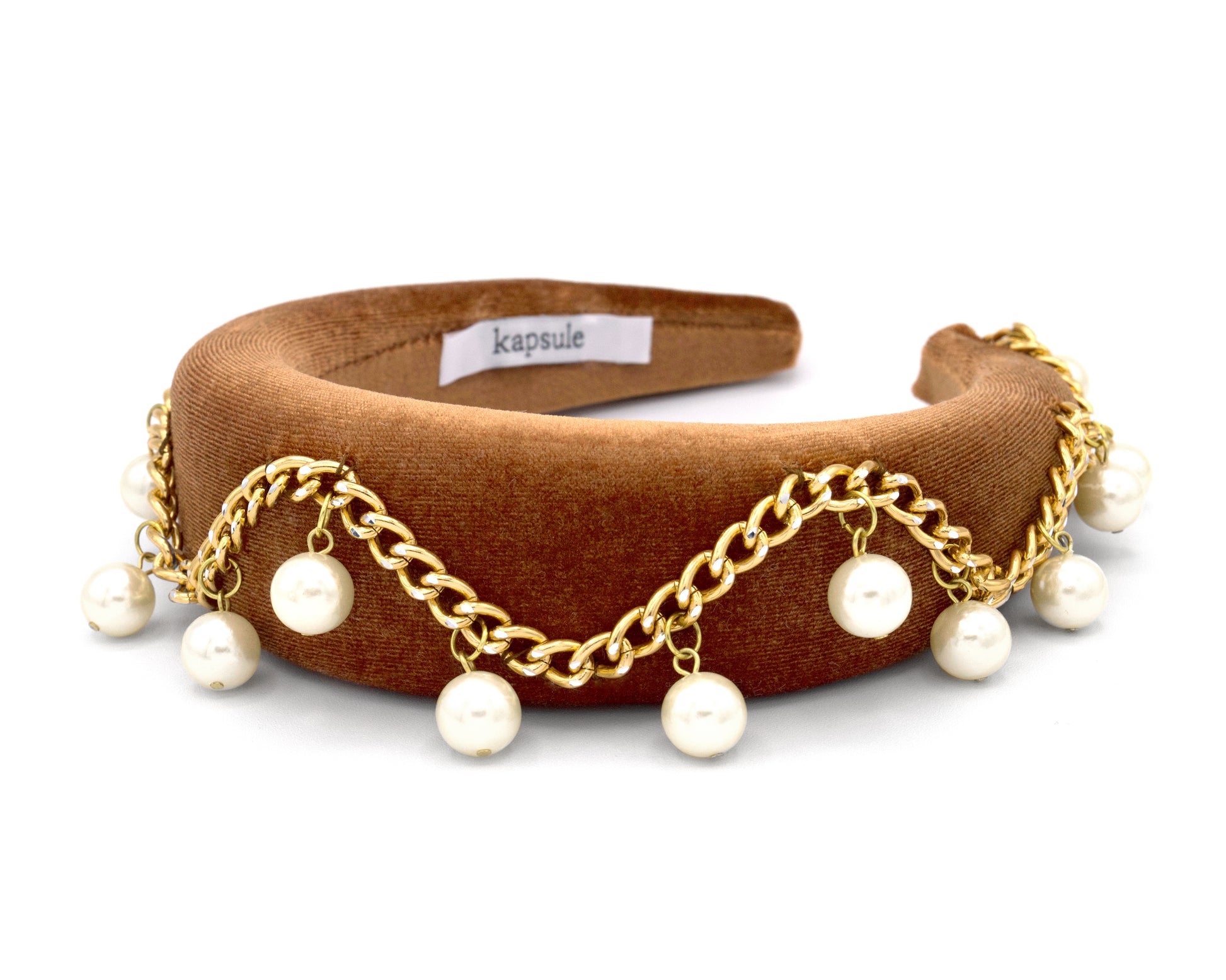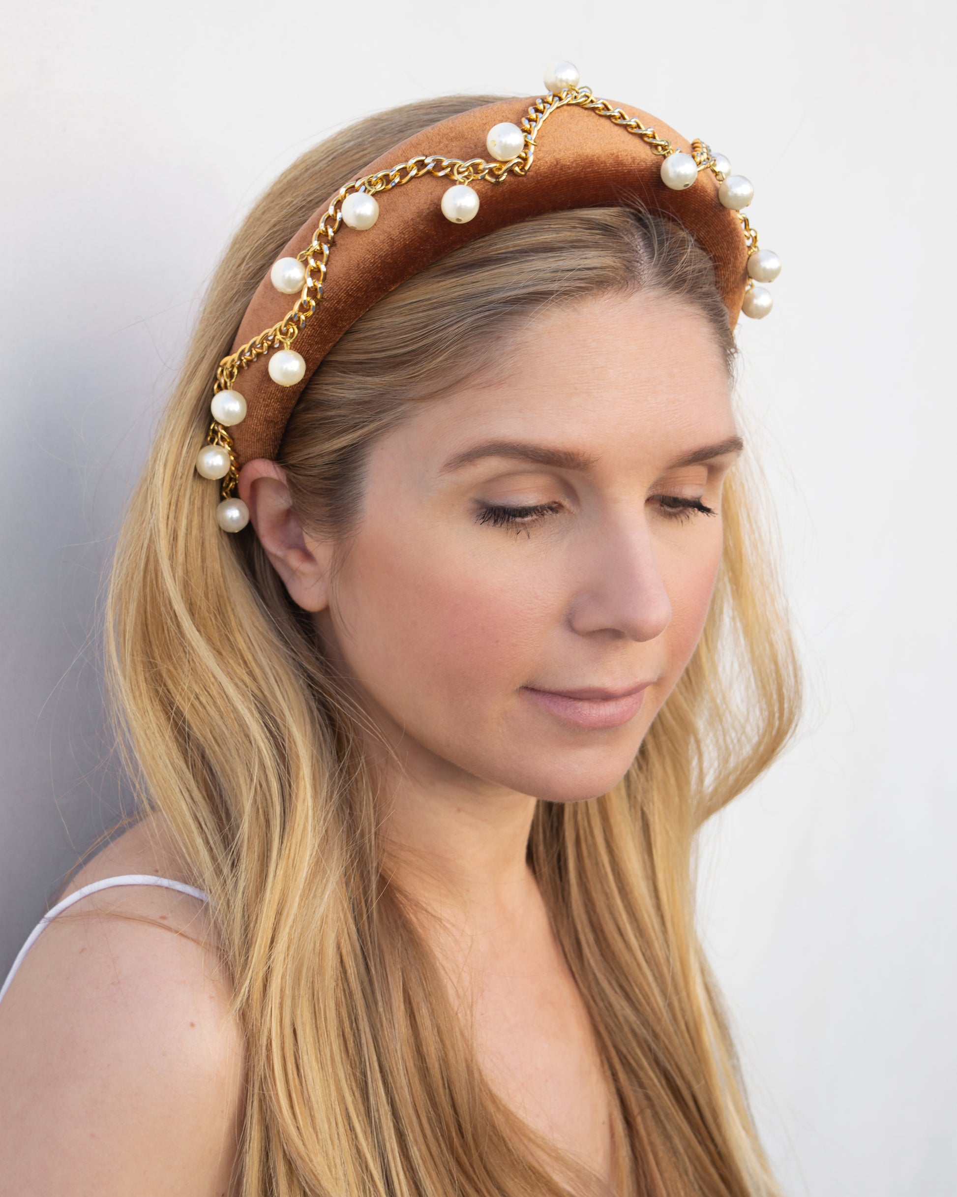 Wow, isn't she a beaut?! Where rocker meets princess. Luella is covered in a rich caramel velvet and adorned with gold chain and round, delicate pearls. Also available in black! The height of this headband adds a bit of magnificence and charm to make you the belle of the ball.