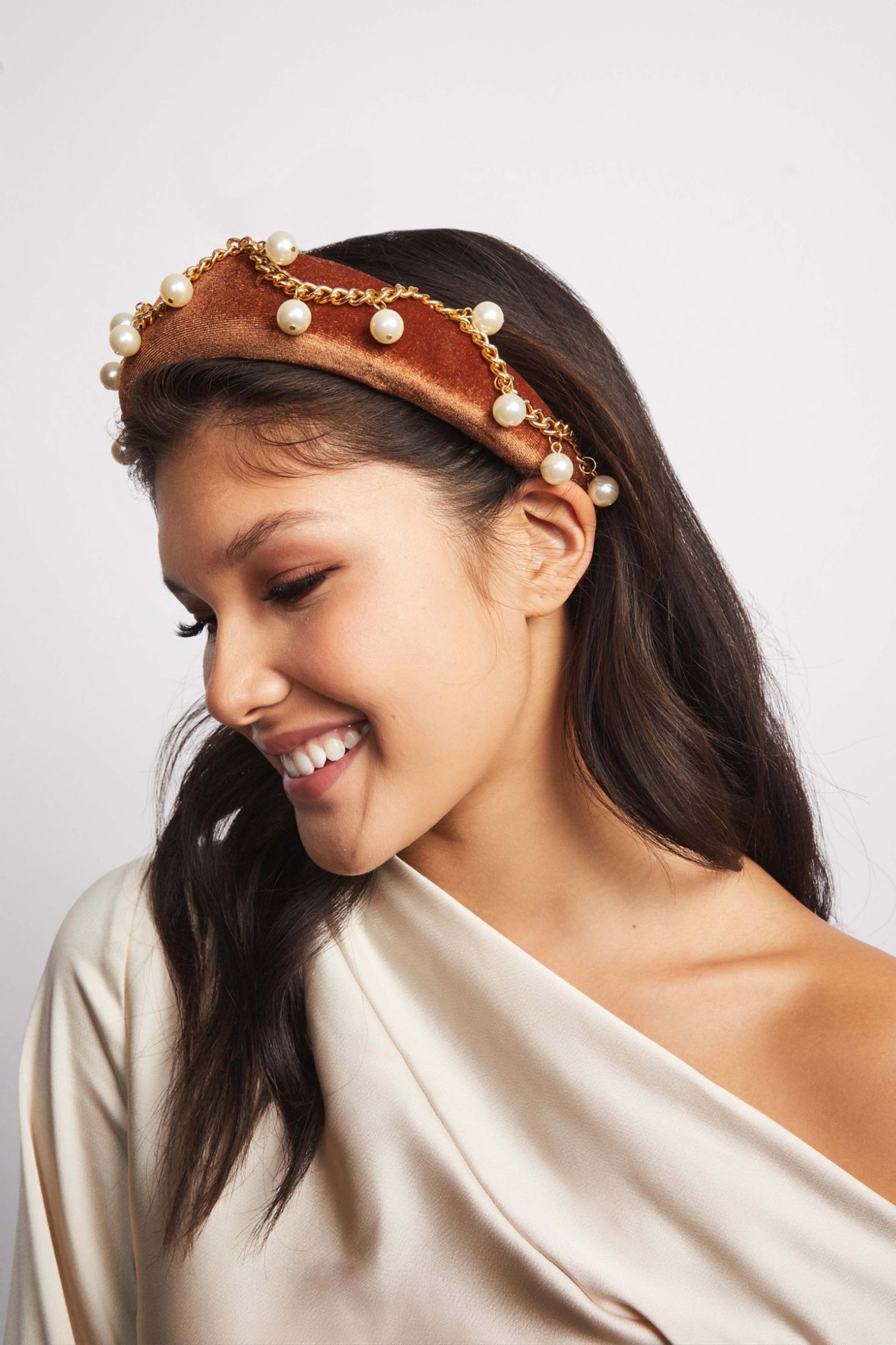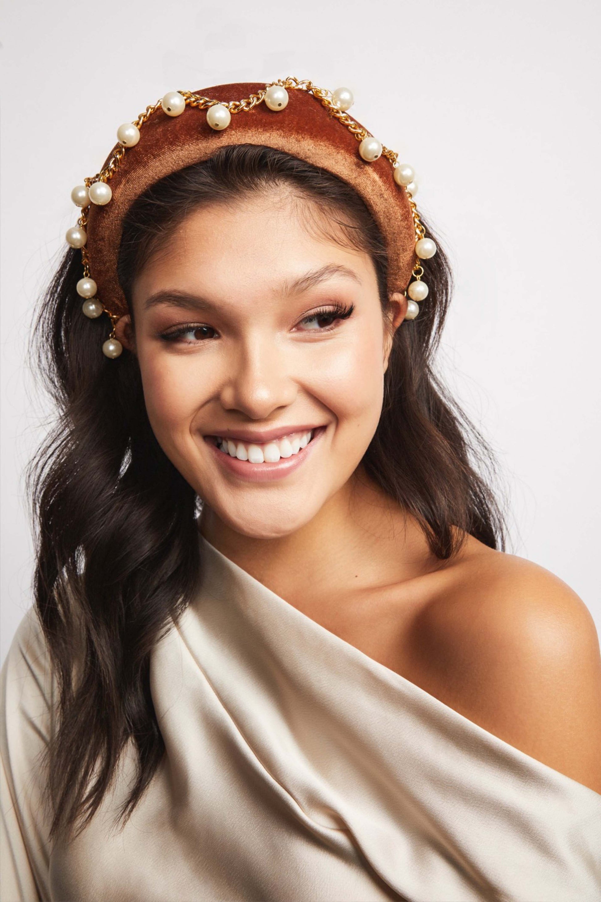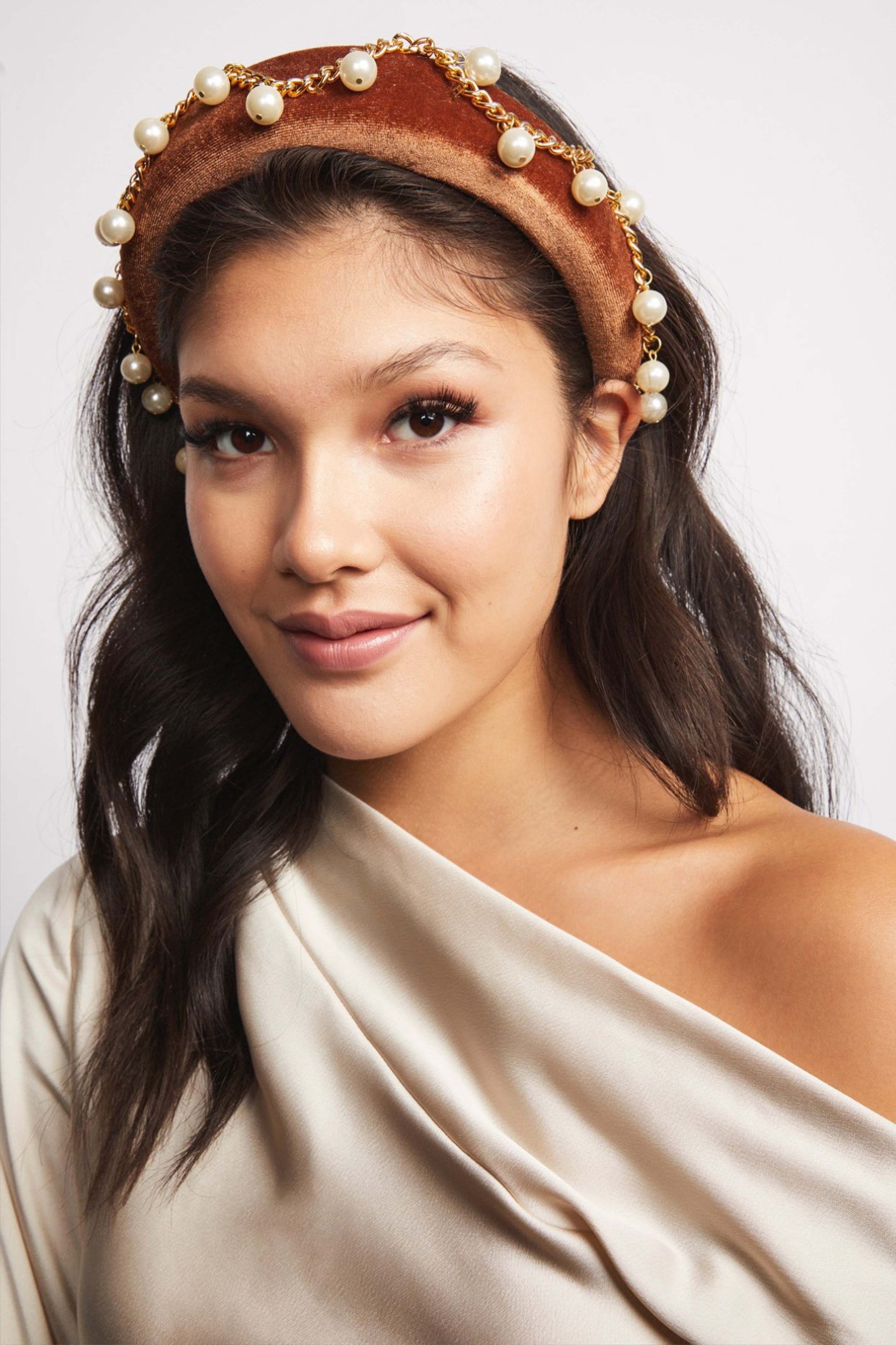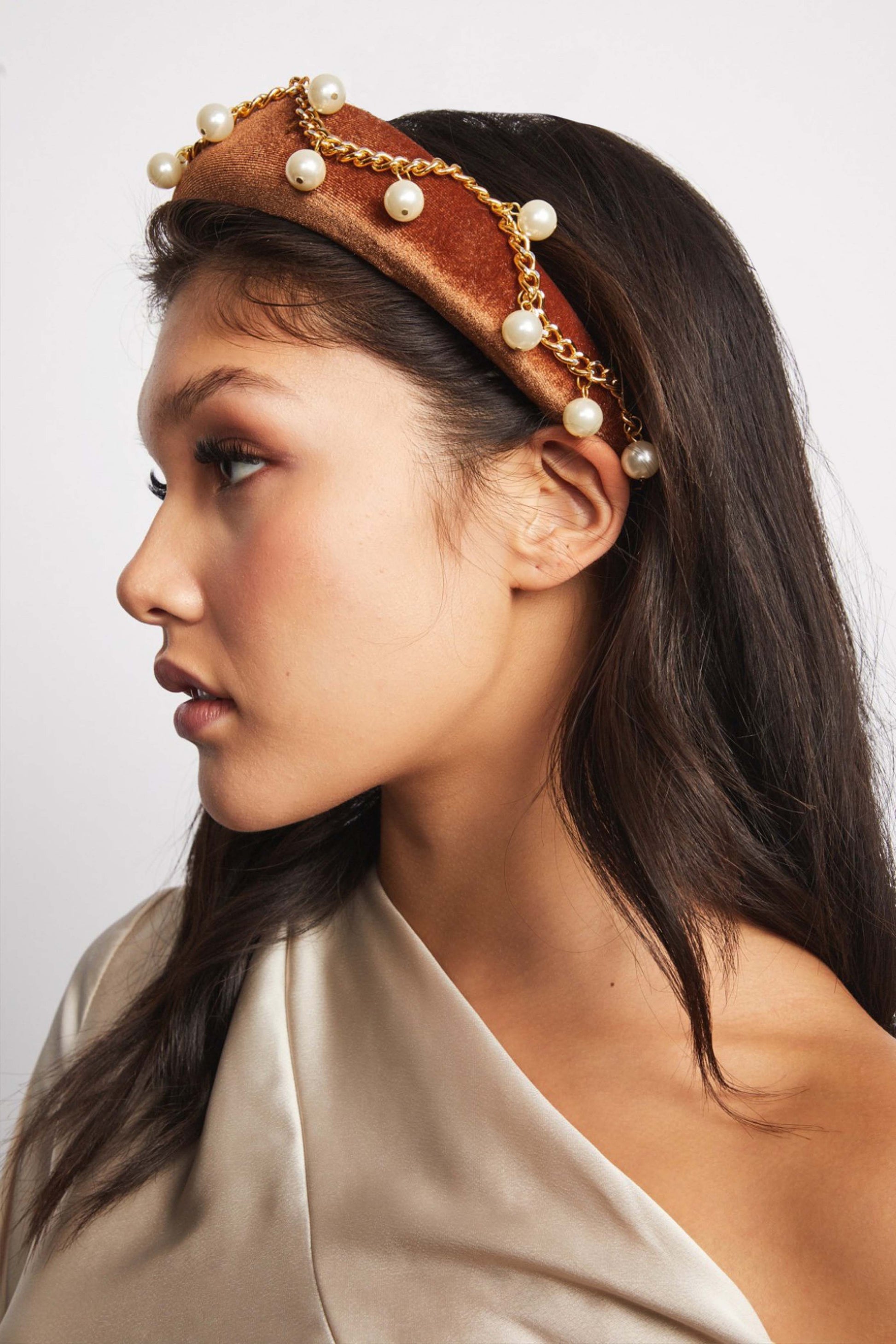 Wow, isn't she a beaut?! Where rocker meets princess. Luella is covered in a rich caramel velvet and adorned with gold chain and round, delicate pearls. Also available in black! The height of this headband adds a bit of magnificence and charm to make you the belle of the ball.