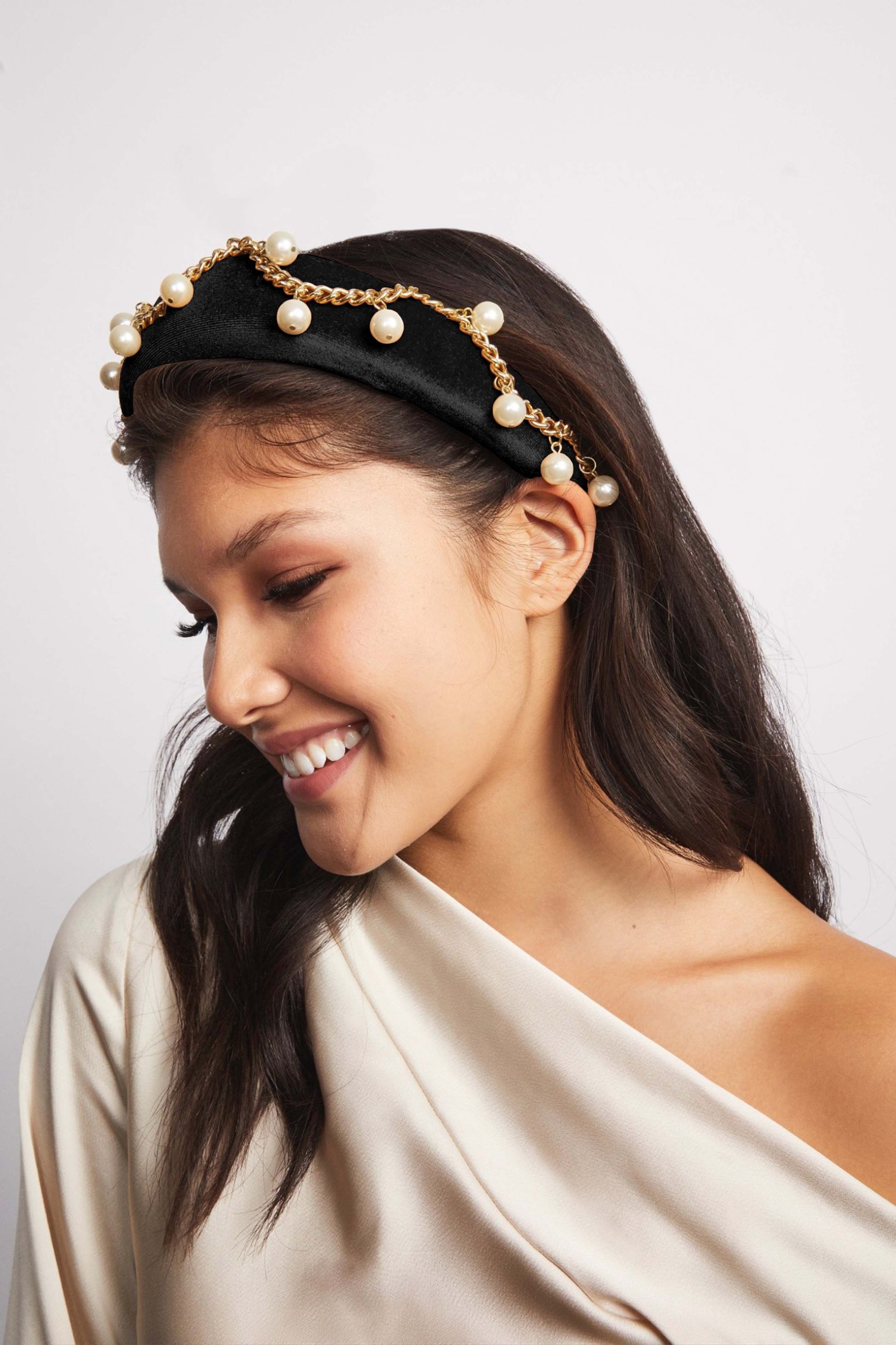 - Velvet Fabric Embellished with Pearl and Gold Chain Detail