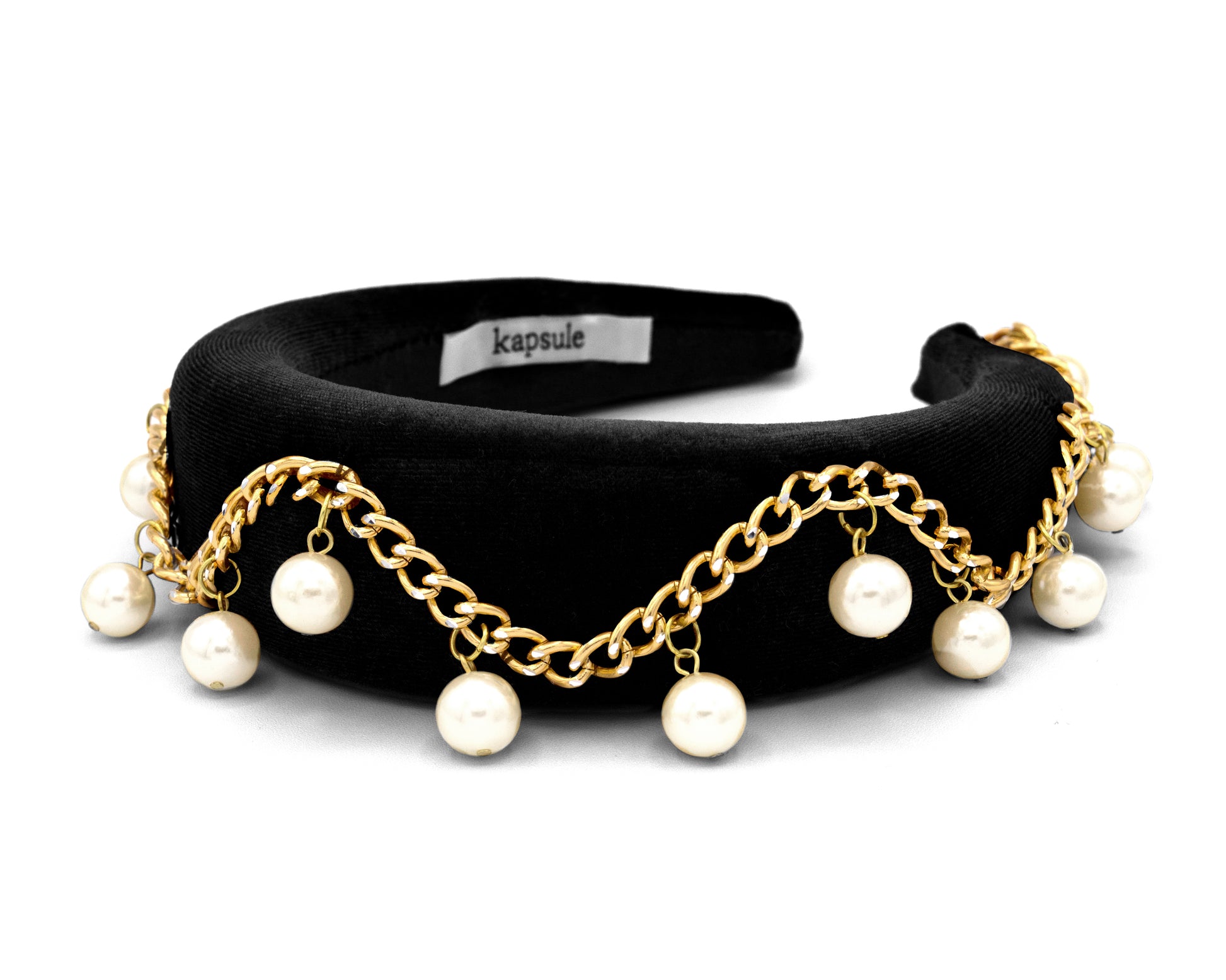 Wow, isn't she a beaut?! Where rocker meets princess. Luella is covered in a rich black velvet and adorned with gold chain and round, delicate pearls. Also available in caramel! The height of this headband adds a bit of magnificence and charm to make you the belle of the ball.