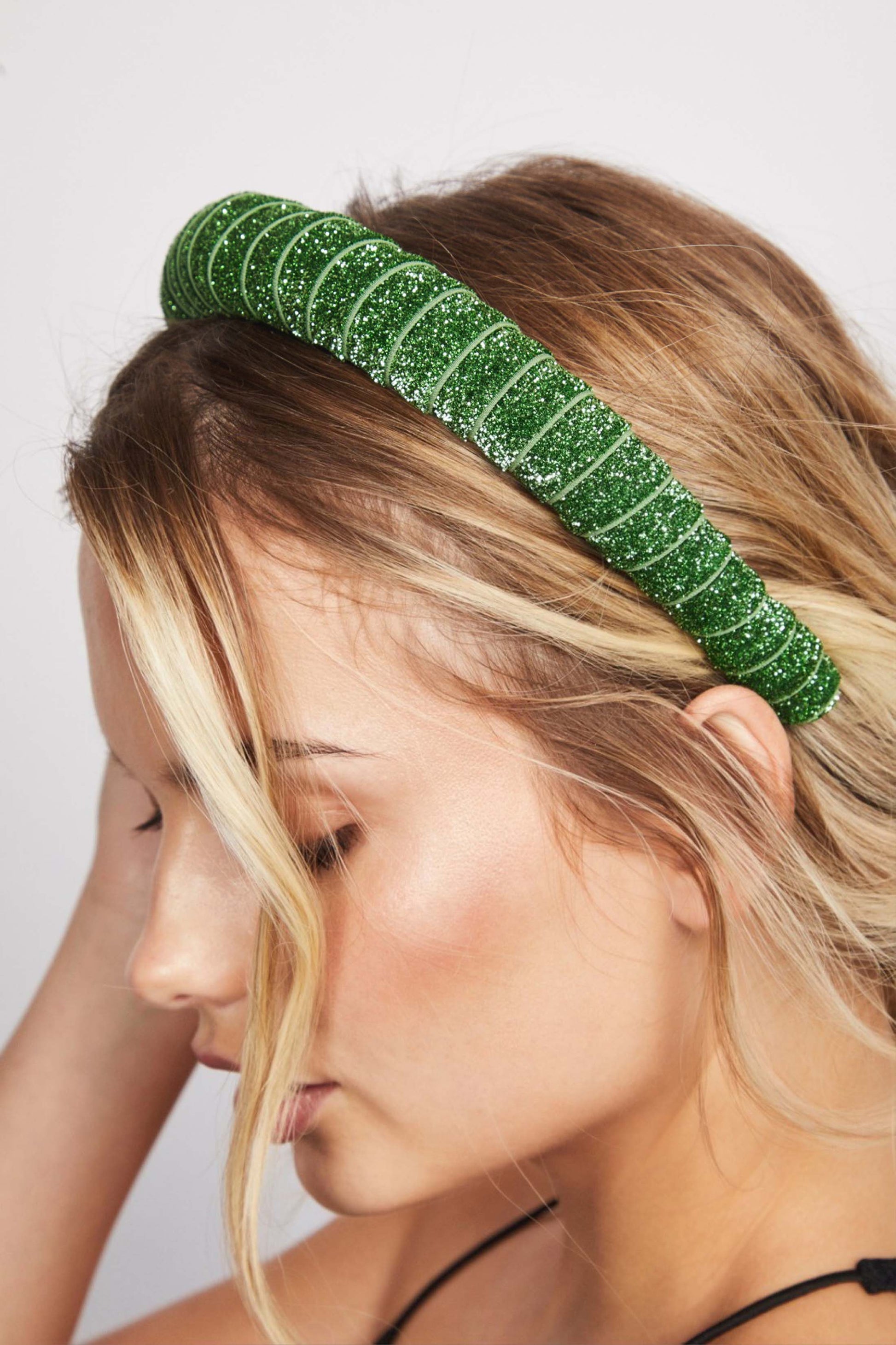Add a little sparkle with our Marin headband. Crafted from a green metallic tinsel ribbon, this headband is hand wrapped around a lightly padded base creating a rich and chic luster. Party time!