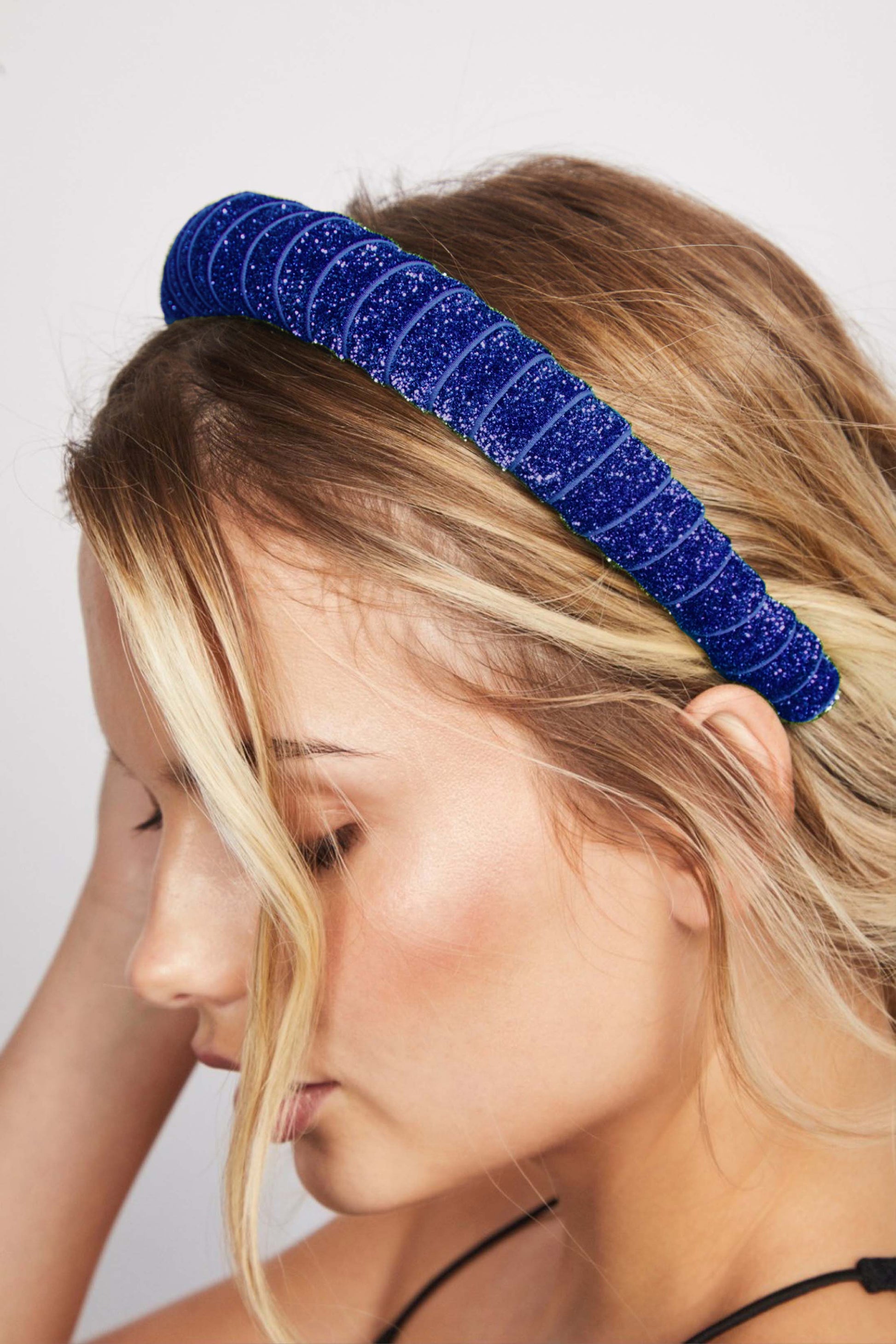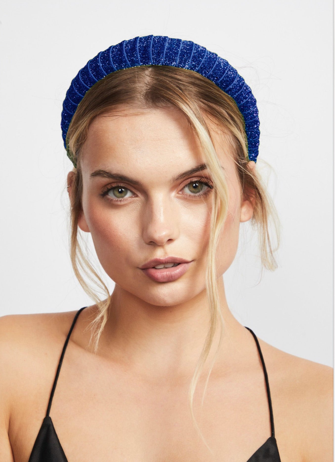 Add a little sparkle with our Marin headband. Crafted from a royal blue metallic tinsel ribbon, this headband is hand wrapped around a lightly padded base creating a rich and chic luster. Party time!