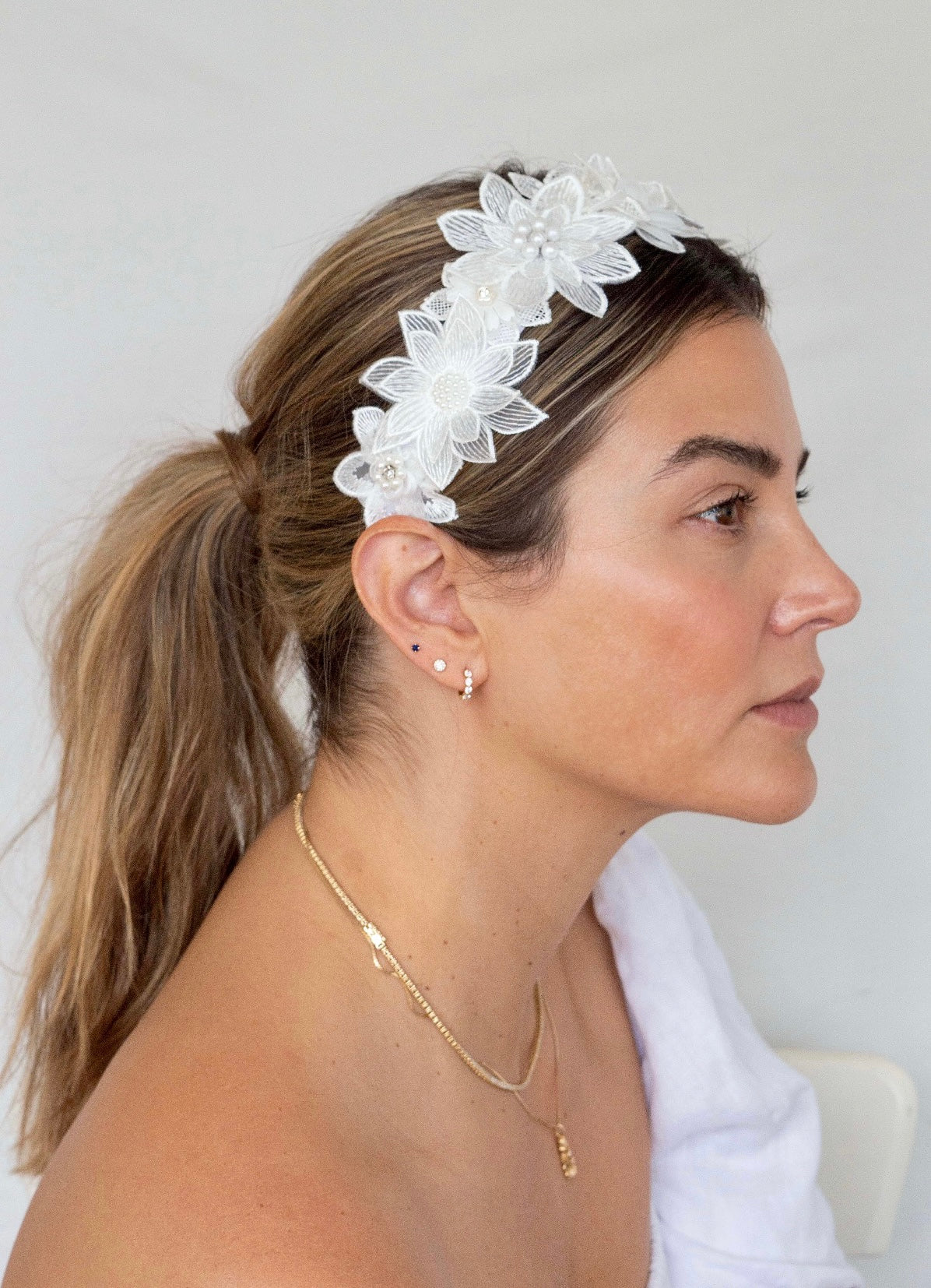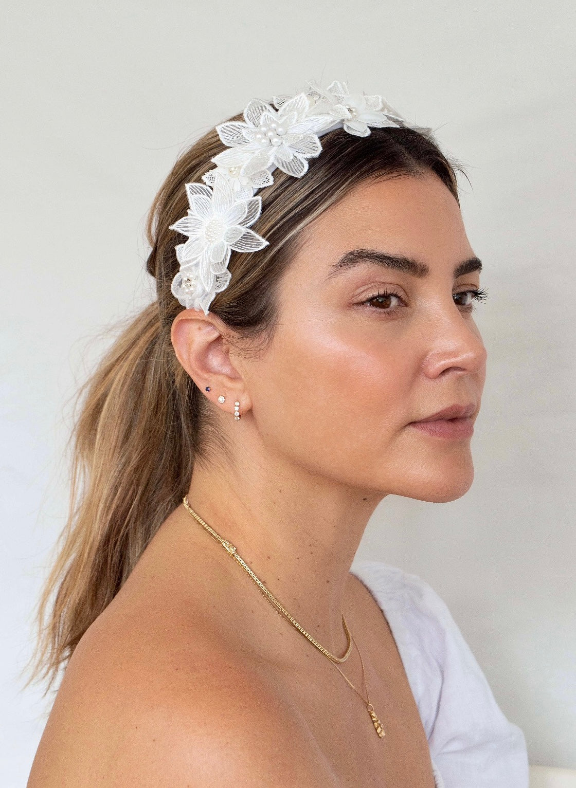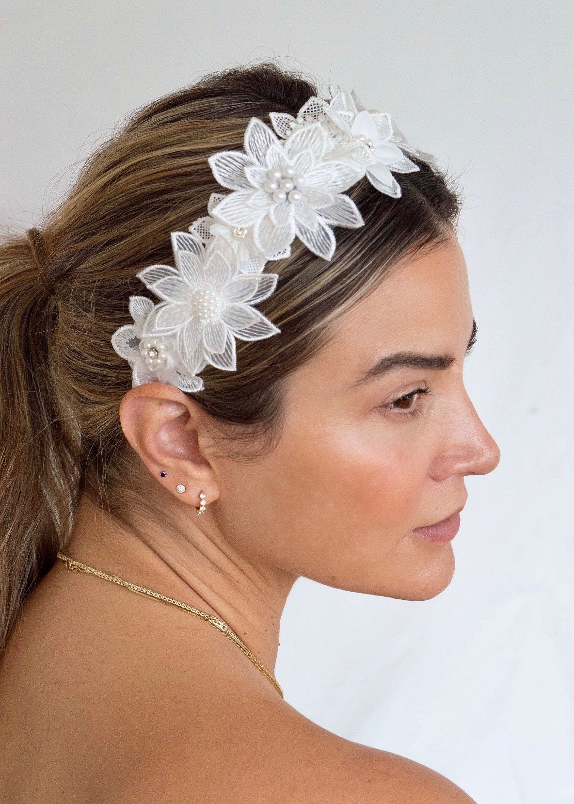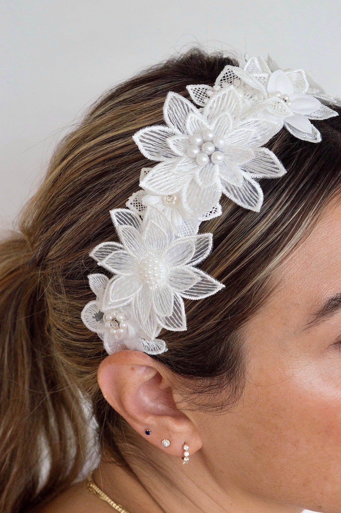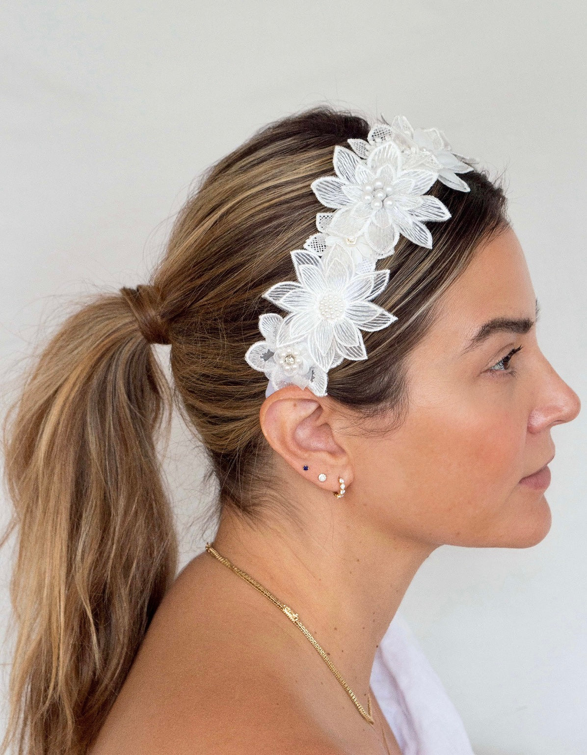 The Meadow headband is adorned with delicate lace flower appliqués. Pearl and rhinestone details add a special touch while the headband resembles a blossoming garden. A great bridal or daytime look.
