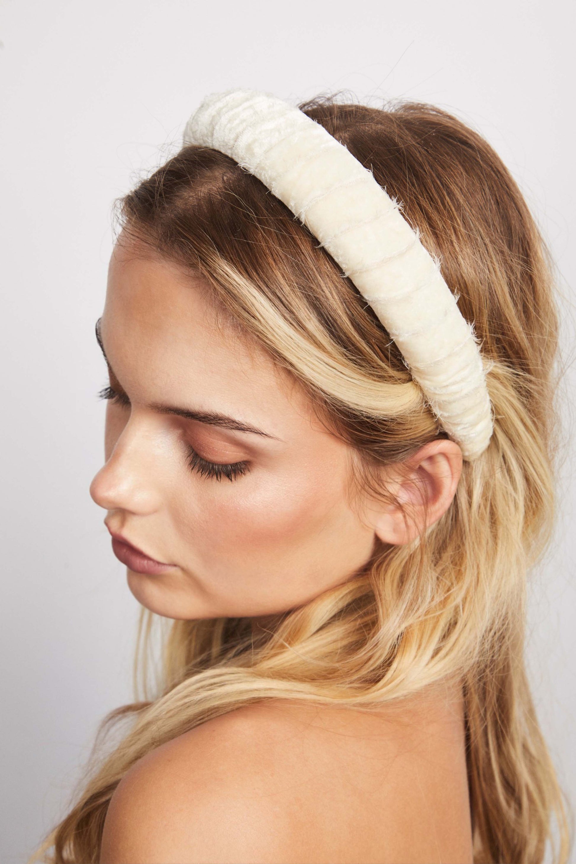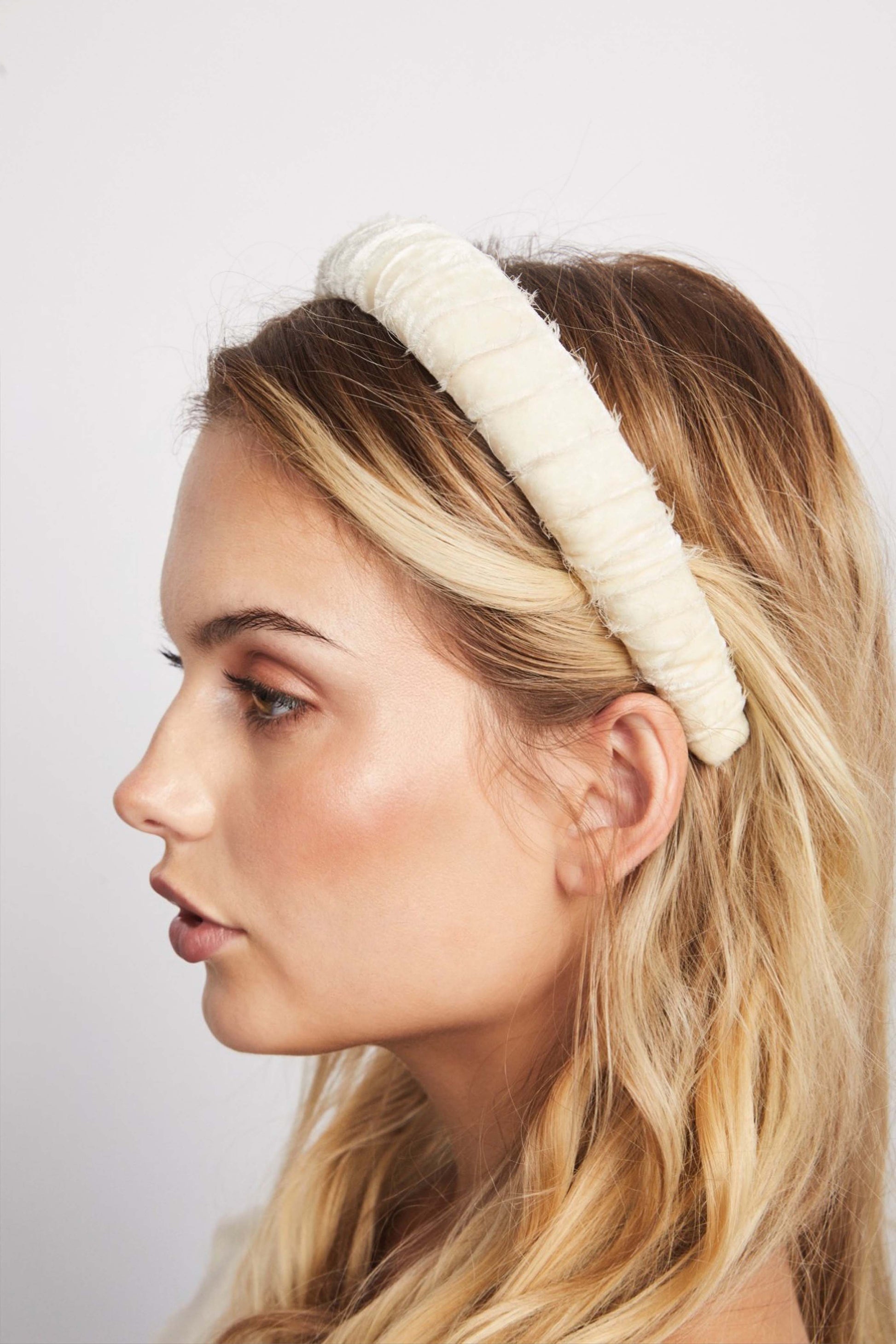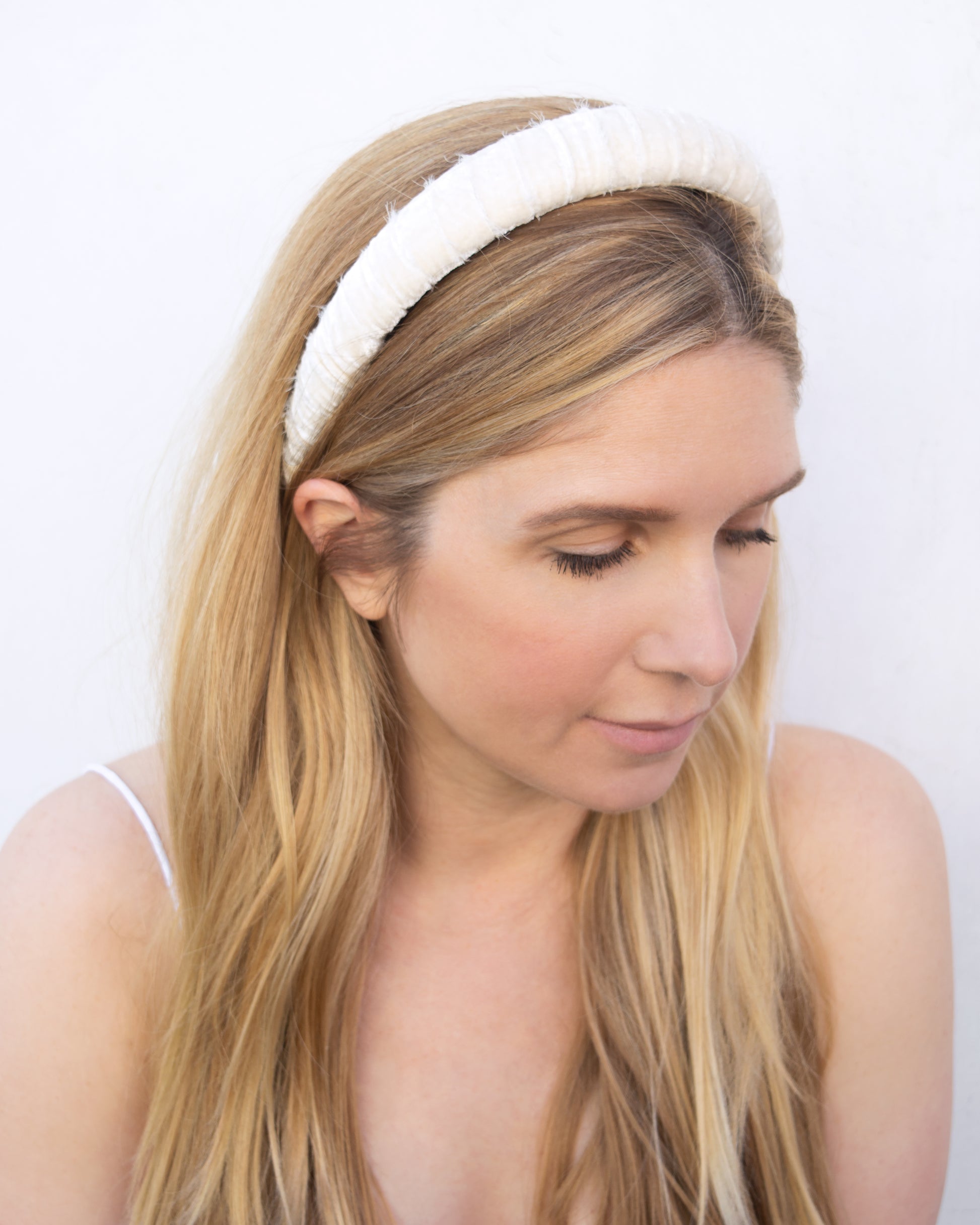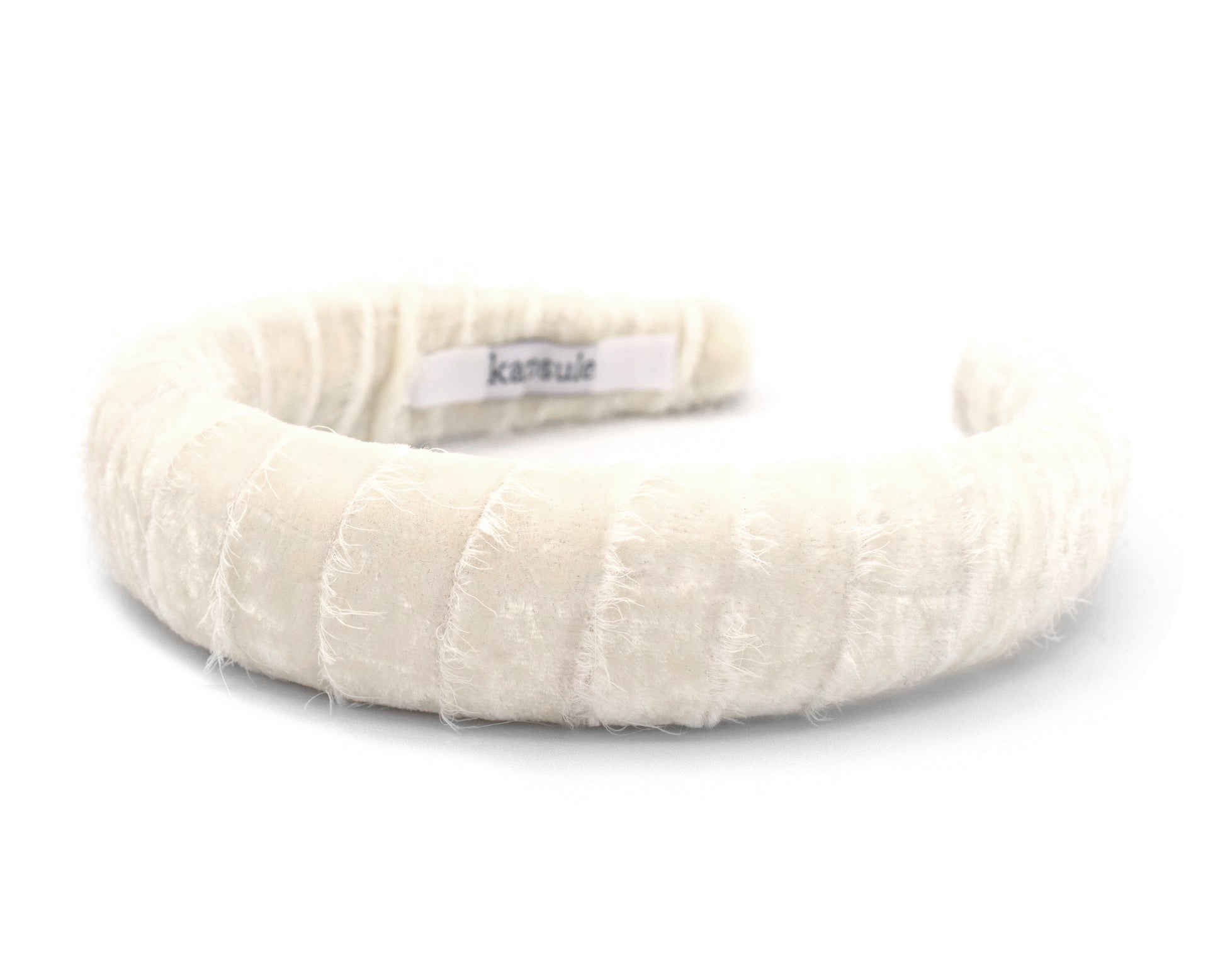 Keep it classic, yet detailed with our Palmer headband. Crafted from hand dyed and torn silk velvet ribbon, this headband is hand wrapped around a lightly padded base creating a soft and glowy ivory luster. Because each piece of ribbon is made by hand, each headband is completely unique.